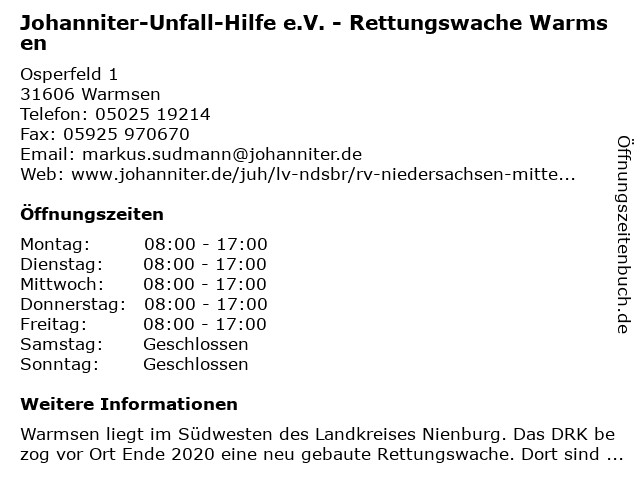 Branchen & Suchbegriffe zu Johanniter-Unfall-Hilfe e.V. - Rettungswache Warmsen:e.v., gemeinnützige organisation, hilfe, hilfsorganisation, johanniter, rettungswache, sozialarbeit, unfall, verband, warmsen, wohlfahrtseinrichtung |