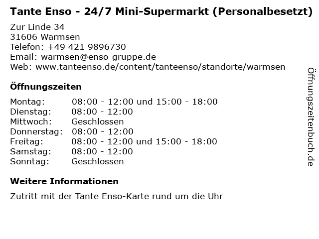 | Branchen & Suchbegriffe zu Tante Enso - 24/7 Mini-Supermarkt (Personalbesetzt):24/7, drogerieartikel, enso, fleisch, gemüse, getränke, lebensmittel, mini, obst, personalbesetzt, supermarkt, tante |