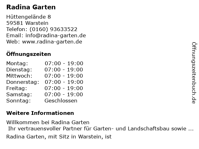 | Öffnungszeiten Radina Garten in Warstein anzeigen | |