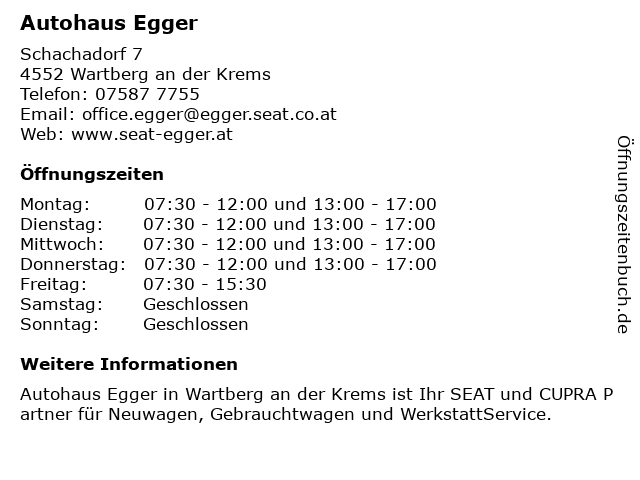 | Öffnungszeiten Autohaus Egger in Wartberg an der Krems anzeigen | |