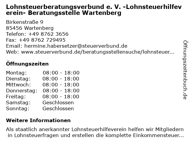 Branchen & Suchbegriffe zu Lohnsteuerberatungsverbund e. V. -Lohnsteuerhilfeverein- Beratungsstelle Wartenberg:beratungsstelle, e., einkommensteuererklärung, lohnsteuerberatungsverbund, lohnsteuererklärung, lohnsteuerhilfe wartenberg, lohnsteuerhilfeverein, lohnsteuerhilfeverein wartenberg, lohnsteuerjahresausgleich, steuerberater, steuererklärung, v., wartenberg |