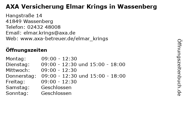 | 2 AXA Versicherung - Hauptvertretung Helmut Pollmanns (Entfernung: 1,69 km) Pappelweg 55b, 41849 Wassenberg 6 AXA Versicherung - Generalvertretung Eckhardt Erkens (Entfernung: 11,76 km) Kölner Straße 42, 41812 Erkelenz |