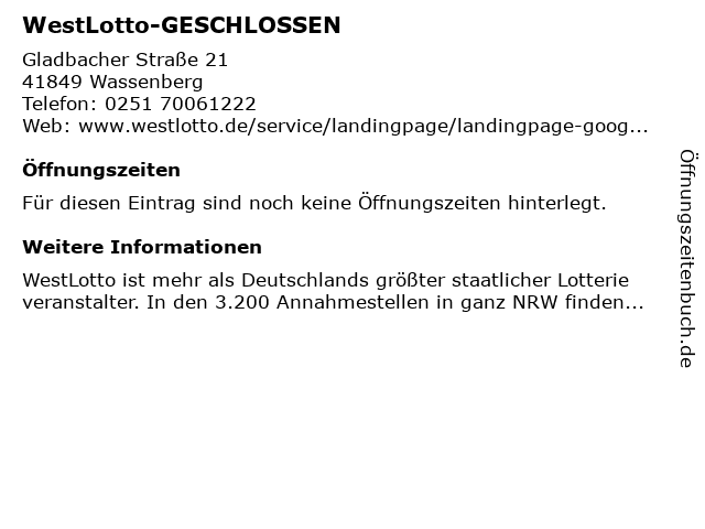 | Telefonnummer WestLotto-GESCHLOSSEN in Wassenberg (0251 70061222) anrufen | |