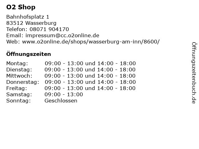 | Öffnungszeiten O2 Shop in Wasserburg anzeigen | |
