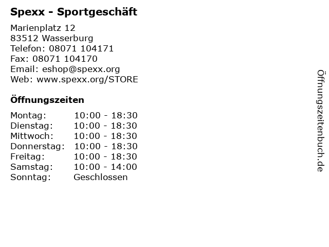 | Öffnungszeiten Spexx - Sportgeschäft in Wasserburg anzeigen | |