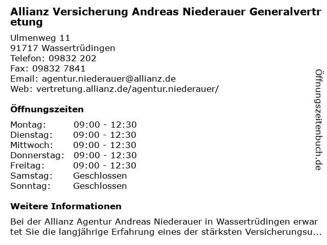 1 Allianz Versicherung Moritz Baumeister Generalvertretung (Entfernung: 5,08 km) Tulpenstraße 2, 91743 Unterschwaningen 2 Allianz Versicherung Engelbert Uhl Generalvertretung (Entfernung: 8,30 km) Limesstraße 2, 86742 Fremdingen 3 Allianz Versicherung Ulrich Sandmeyer e.K. Generalvertretung (Entfernung: 10,40 km) Hadergasse 7, 86732 Oettingen in Bayern 4 Allianz Versicherung Christian Frank Generalvertretung (Entfernung: 12,64 km) Am Plärrer 3, 91572 Bechhofen 5 Allianz Versicherung Axel Simon Generalvertretung (Entfernung: 14,93 km) Burgstallstraße 5, 91710 Gunzenhausen 6 R+V Versicherung Dinkelsbühl - Generalvertretung Manuel Nachtrab (Entfernung: 16,37 km) Botzenweiler 25, 91550 Dinkelsbühl |