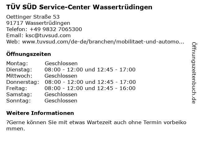 Branchen & Suchbegriffe zu TÜV SÜD Service-Center Wassertrüdingen:abgasuntersuchung, center, hauptuntersuchung, kfz, oldtimergutachten, service, süd, tüv |