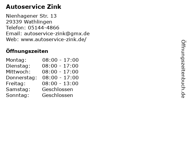 | Öffnungszeiten Autoservice Zink in Wathlingen anzeigen | |