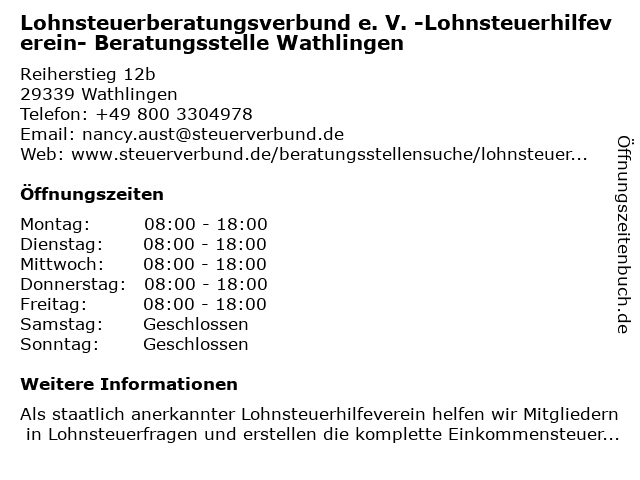 Branchen & Suchbegriffe zu Lohnsteuerberatungsverbund e. V. -Lohnsteuerhilfeverein- Beratungsstelle Wathlingen:beratungsstelle, e., einkommensteuererklärung, lohnsteuerberatungsverbund, lohnsteuererklärung, lohnsteuerhilfe uetze / ot obershagen, lohnsteuerhilfeverein, lohnsteuerhilfeverein uetze / ot obershagen, lohnsteuerjahresausgleich, steuerberater, steuererklärung, steuerhilfe, steuerverbund, v., wathlingen |