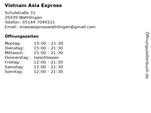 | Adresse Vietnam Asia Express in Wathlingen anzeigen |