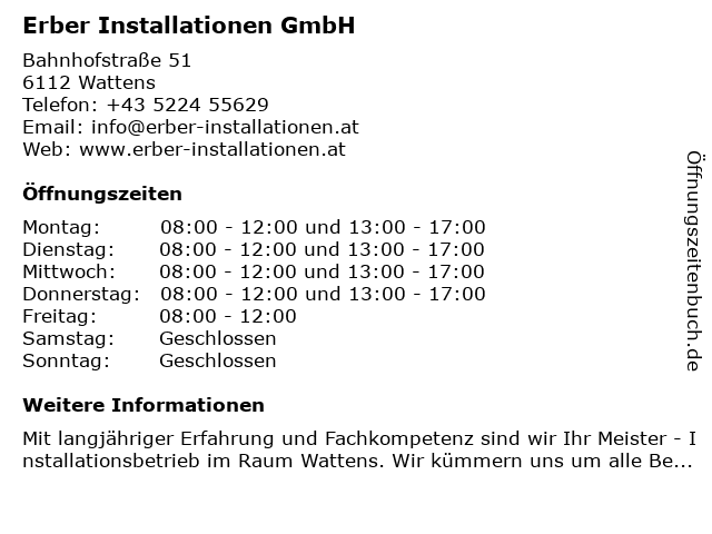 | Öffnungszeiten Erber Installationen GmbH in Wattens anzeigen | |