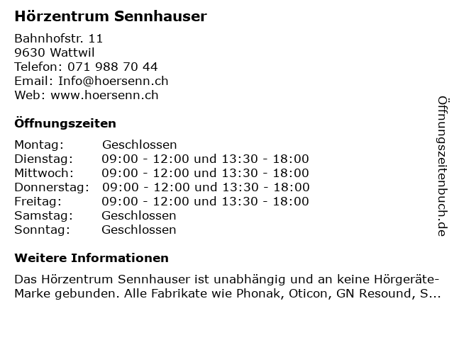 | Öffnungszeiten Hörzentrum Sennhauser in Wattwil anzeigen | |