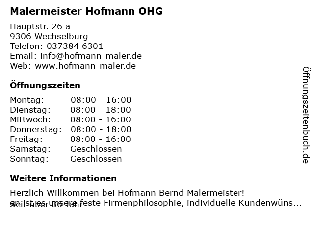 | Öffnungszeiten Malermeister Hofmann OHG in Wechselburg anzeigen | |