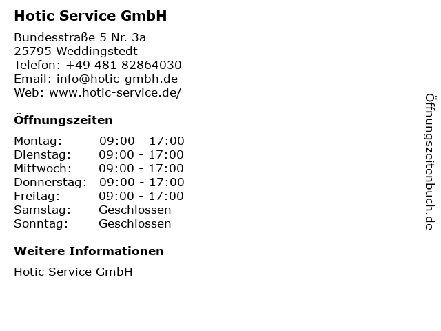 | Öffnungszeiten Hotic Service GmbH in Weddingstedt anzeigen | |