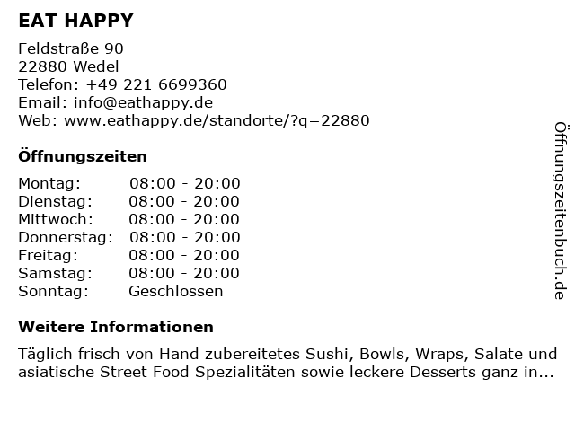 | Öffnungszeiten EAT HAPPY in Wedel anzeigen | |
