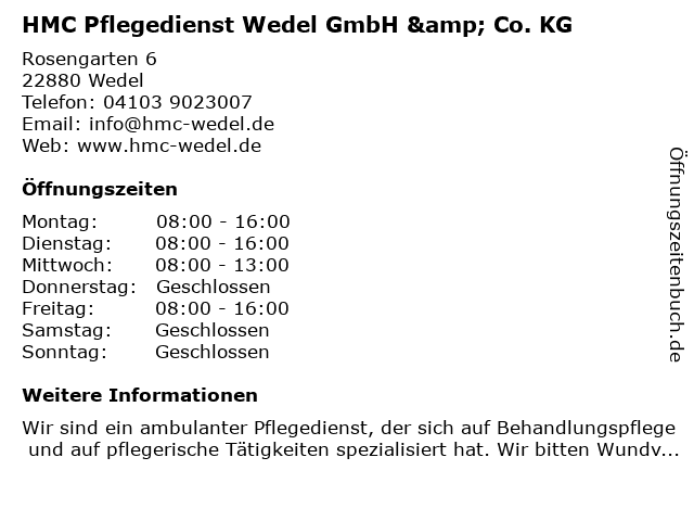Branchen & Suchbegriffe zu HMC Pflegedienst Wedel GmbH & Co. KG:hmc, häusliche pflege, pflegedienst, pflegeheim, wedel |