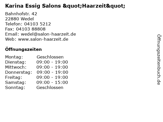 | Öffnungszeiten Karina Essig Salons "Haarzeit" in Wedel anzeigen | |