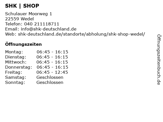 | Öffnungszeiten SHK | SHOP in Wedel anzeigen | |