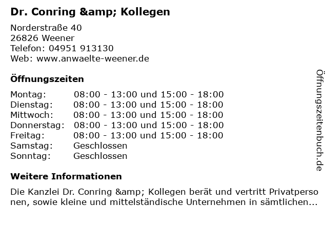 | Öffnungszeiten Dr. Conring & Kollegen in Weener anzeigen | |