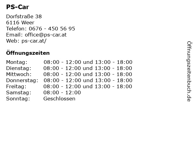 | Öffnungszeiten PS-Car in Weer anzeigen | |