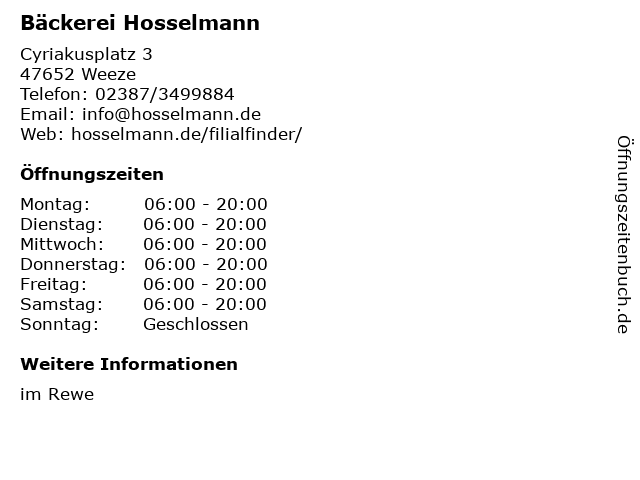 | Öffnungszeiten Bäckerei Hosselmann in Weeze anzeigen | |