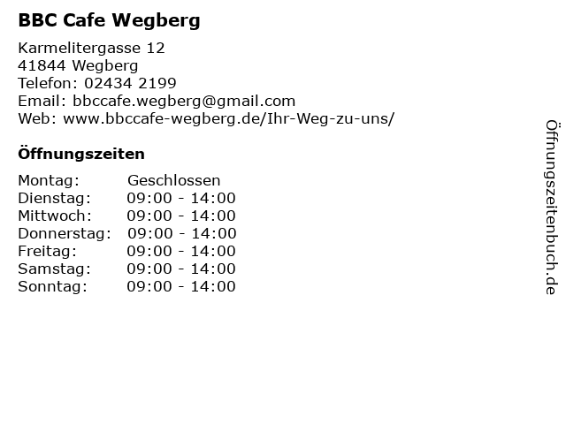 | Öffnungszeiten BBC Cafe Wegberg in Wegberg anzeigen | |