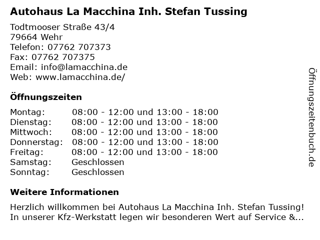 Branchen & Suchbegriffe zu Autohaus La Macchina Inh. Stefan Tussing:abgasuntersuchung, autohaus, autoklimaanlagen, autoreparatur, bremsendienste, la, macchina, motoreninstandsetzung, stefan, tussing |