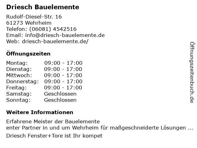 | Öffnungszeiten Driesch Bauelemente in Wehrheim anzeigen | |