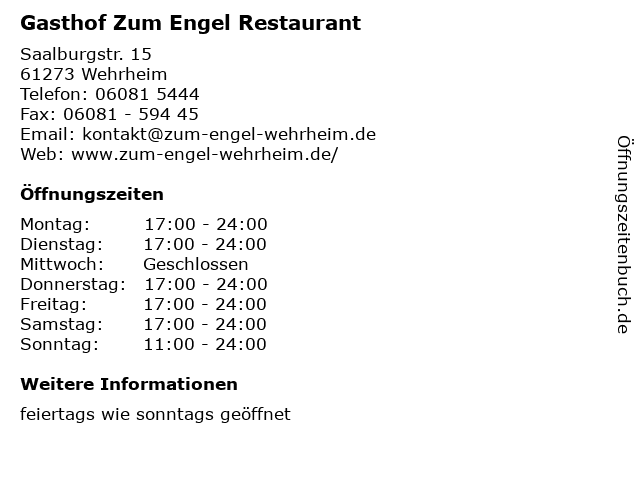 | Öffnungszeiten Gasthof Zum Engel Restaurant in Wehrheim anzeigen | |
