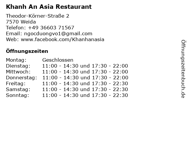 | Öffnungszeiten Khanh An Asia Restaurant in Weida anzeigen | |