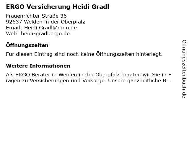 | Öffnungszeiten ERGO Versicherung Heidi Gradl in Weiden in der Oberpfalz anzeigen | |