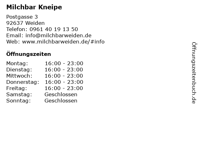 | Öffnungszeiten Milchbar Kneipe in Weiden anzeigen | |