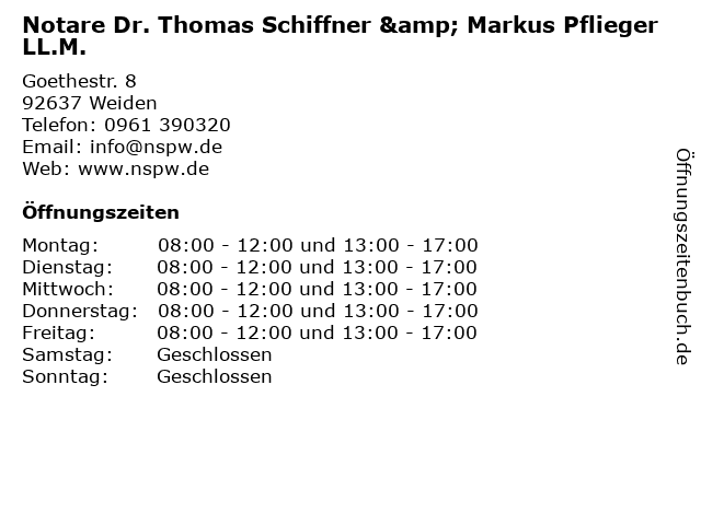 1 Notare Dr. Thomas Schiffner Dr. Damian Wolfgang Najdecki (Entfernung: 0,01 km) Goethestraße 8, 92637 Weiden 3 Dr. med. dent. Markus Schmid Berufsausübungsgemeinschaft (Entfernung: 0,16 km) Wörthstr. 9, 92637 Weiden 6 |