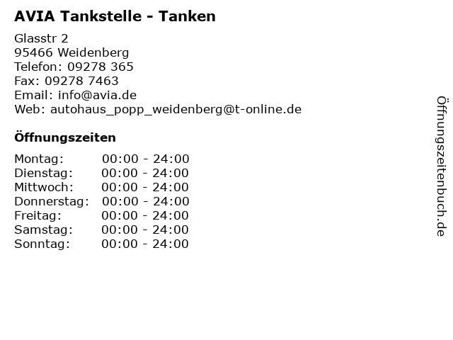 | Öffnungszeiten AVIA Tankstelle - Tanken in Weidenberg anzeigen | |
