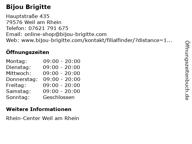 | Öffnungszeiten Bijou Brigitte in Weil am Rhein anzeigen | |