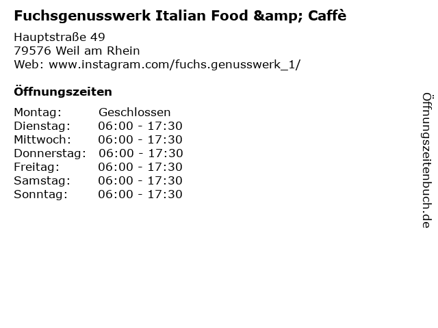 | Öffnungszeiten Fuchsgenusswerk Italian Food & Caffè in Weil am Rhein anzeigen | |