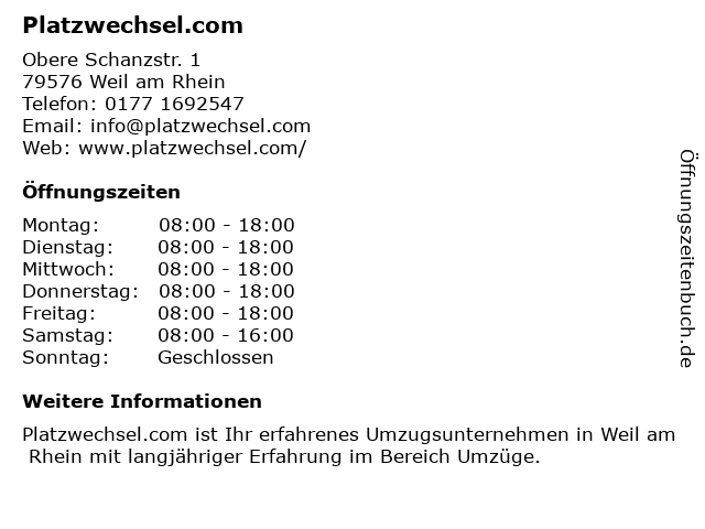 | Öffnungszeiten Platzwechsel.com in Weil am Rhein anzeigen | |