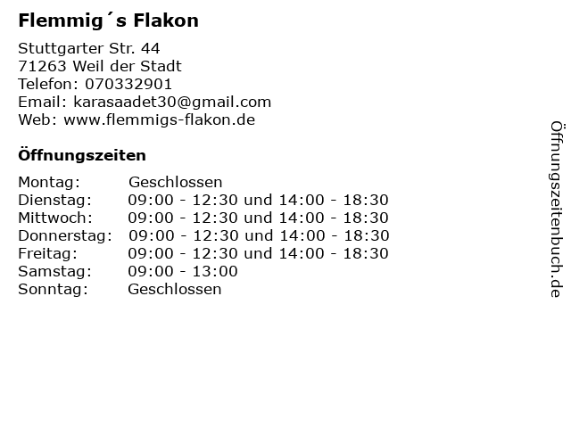 | Öffnungszeiten Flemmig´s Flakon in Weil der Stadt anzeigen | |