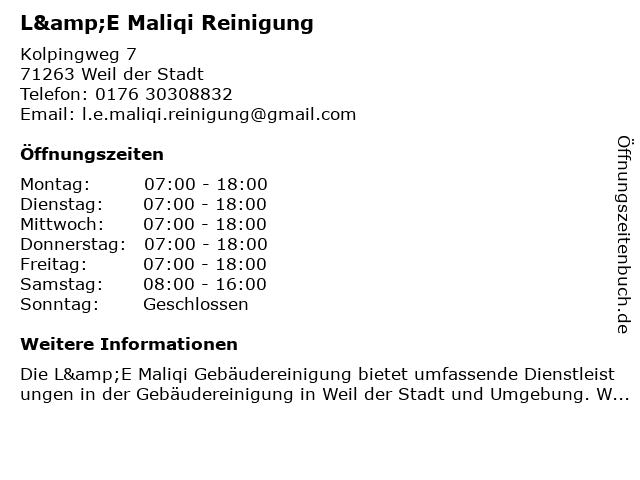 | Öffnungszeiten L&E Maliqi Reinigung in Weil der Stadt anzeigen | |