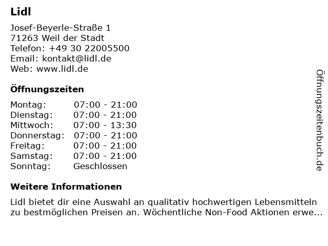 | Öffnungszeiten Lidl in Weil der Stadt anzeigen | |