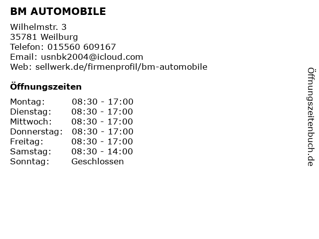 | Öffnungszeiten BM AUTOMOBILE in Weilburg anzeigen | |