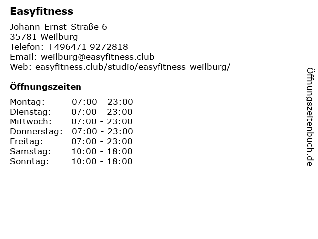 | Öffnungszeiten Easyfitness in Weilburg anzeigen | |