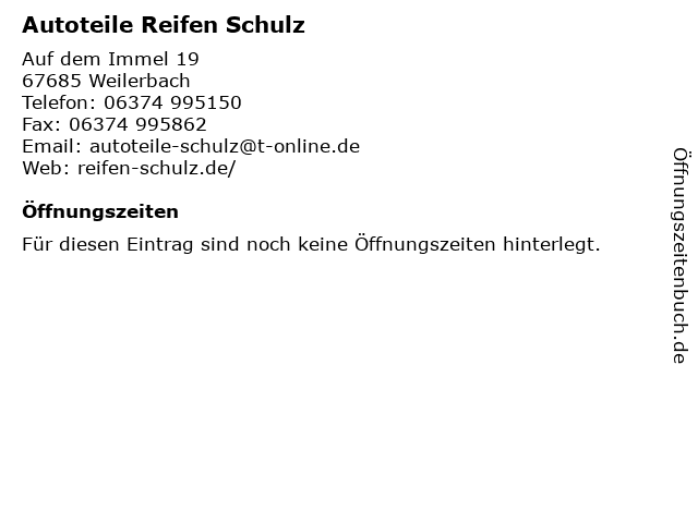 | Öffnungszeiten Autoteile Reifen Schulz in Weilerbach anzeigen | |