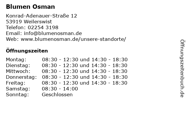 | Öffnungszeiten Blumen Osman in Weilerswist anzeigen | |