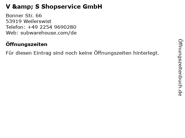 | Öffnungszeiten V & S Shopservice GmbH in Weilerswist anzeigen | |