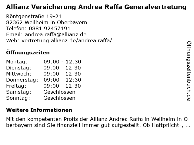2 Allianz Versicherung Blum Inh. Simone Jones Hauptvertretung (Entfernung: 0,73 km) Sondermayerstraße 4, 82362 Weilheim in Oberbayern 4 Allianz Versicherung Georg Höcker Generalvertretung (Entfernung: 0,95 km) Münchener Straße 10, 82362 Weilheim in Oberbayern 5 Praxis für Naturheilkunde und Psychotherapie Andrea Beine (Entfernung: 3,19 km) Dorfstr. 20, 82362 Weilheim 6 |