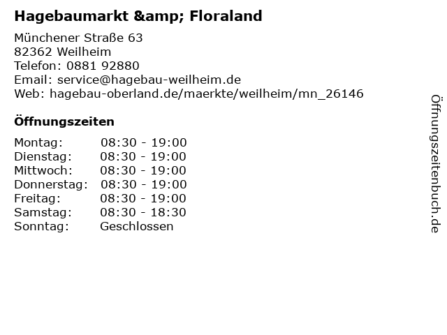 | Öffnungszeiten Hagebaumarkt & Floraland in Weilheim anzeigen | |