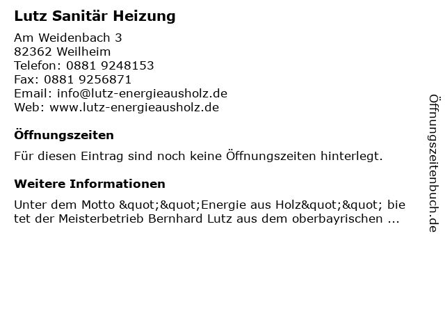 | Öffnungszeiten Lutz Sanitär Heizung in Weilheim anzeigen | |