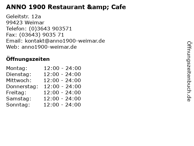 | Öffnungszeiten ANNO 1900 Restaurant & Cafe in Weimar anzeigen | |