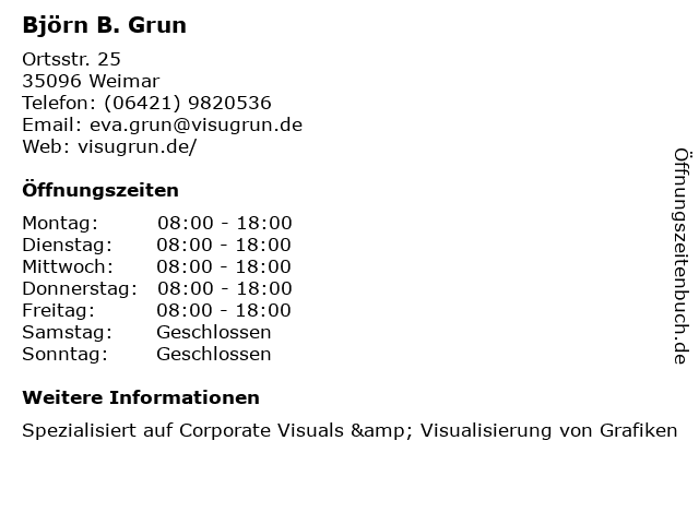 | Öffnungszeiten Björn B. Grun in Weimar anzeigen | |